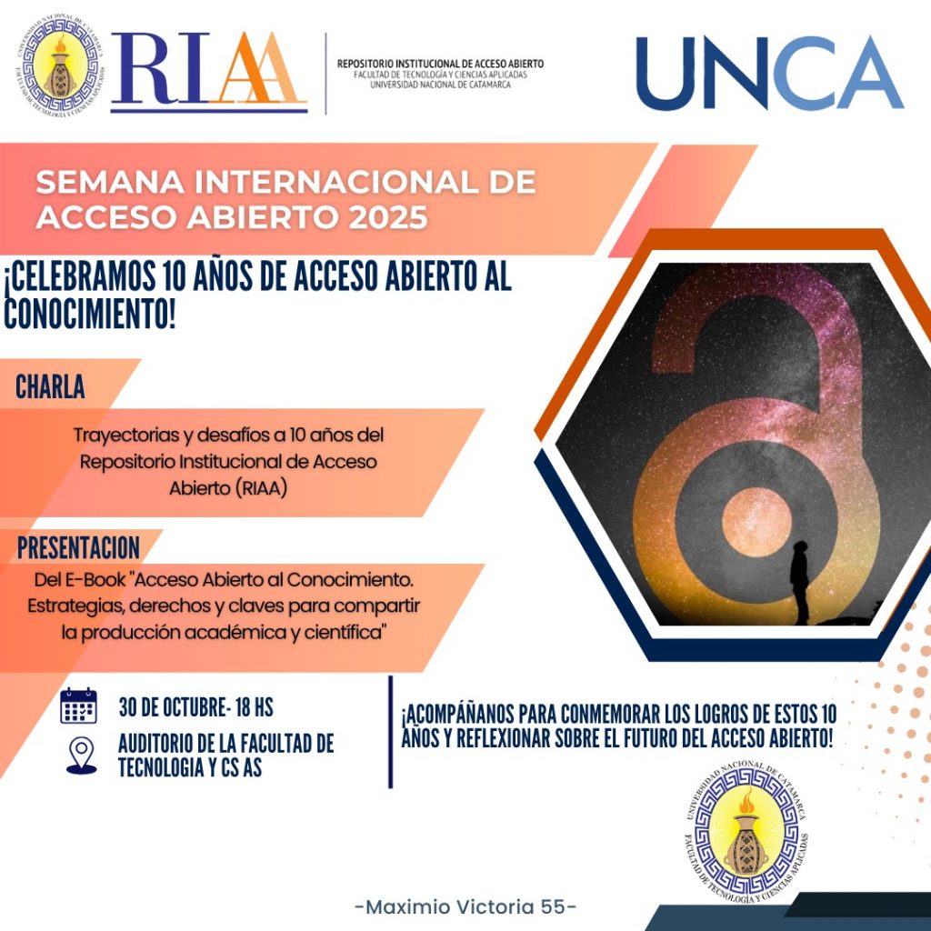 En el marco de la Semana Internacional del Acceso Abierto, la Facultad de Tecnología y Ciencias Aplicadas de la Universidad Nacional de Catamarca (UNCA) conmemora el 10° aniversario del Repositorio Institucional de Acceso Abierto (RIAA), un espacio que promueve la difusión libre y gratuita de la producción académica y científica.