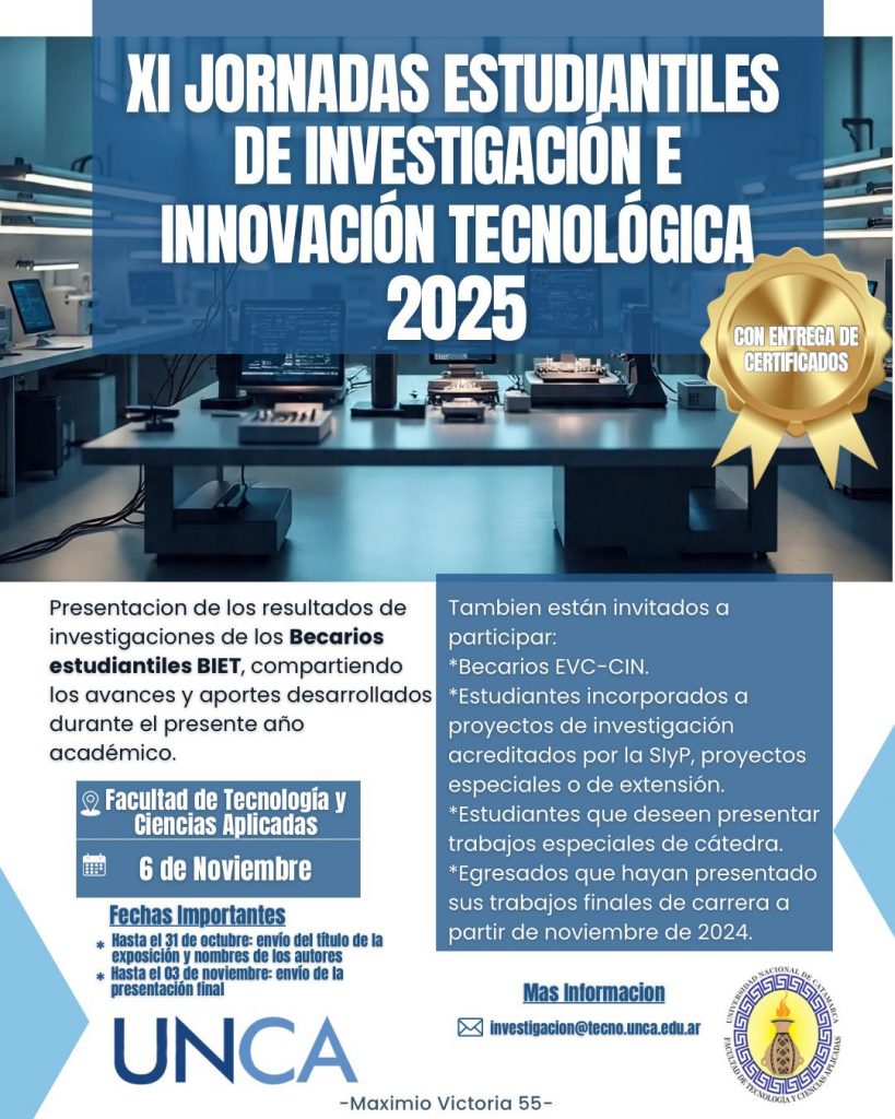 Las actividades se desarrollarán en la Facultad de Tecnología y Ciencias Aplicadas de la Universidad Nacional de Catamarca (UNCA). Los becarios estudiantiles BIET (Becas de Investigación para Estudiantes), presentarán los resultados de sus investigaciones, compartiendo los avances y aportes desarrollados durante el presente año académico.