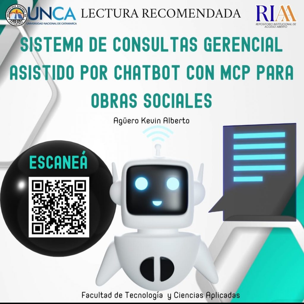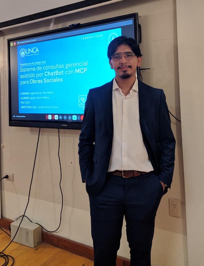 Un sistema de consultas gerenciales web asistido por un chatbot, diseñado para facilitar el acceso a información y apoyar la toma de decisiones dentro de organizaciones vinculadas a obras sociales, fue presentado en la Facultad de Tecnología y Ciencias Aplicadas de la Universidad Nacional de Catamarca(UNCA).